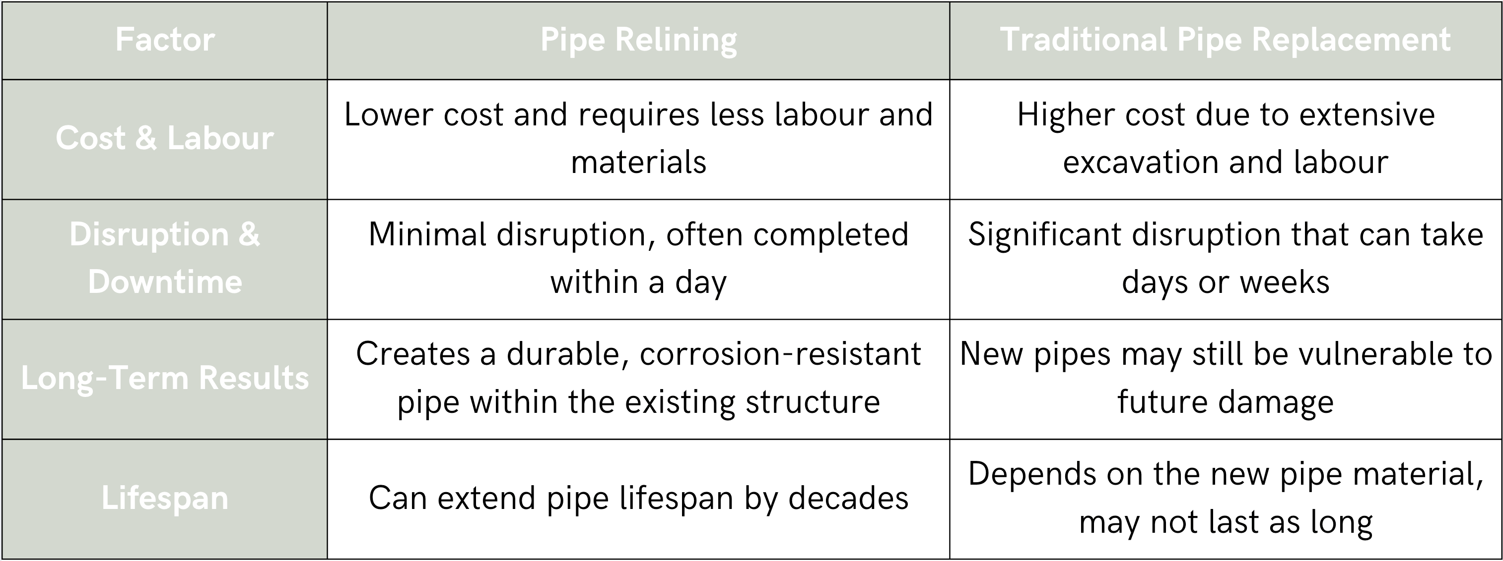 Given these drawbacks, many property owners are turning to pipe relining as a less invasive, more cost-effective alternative.